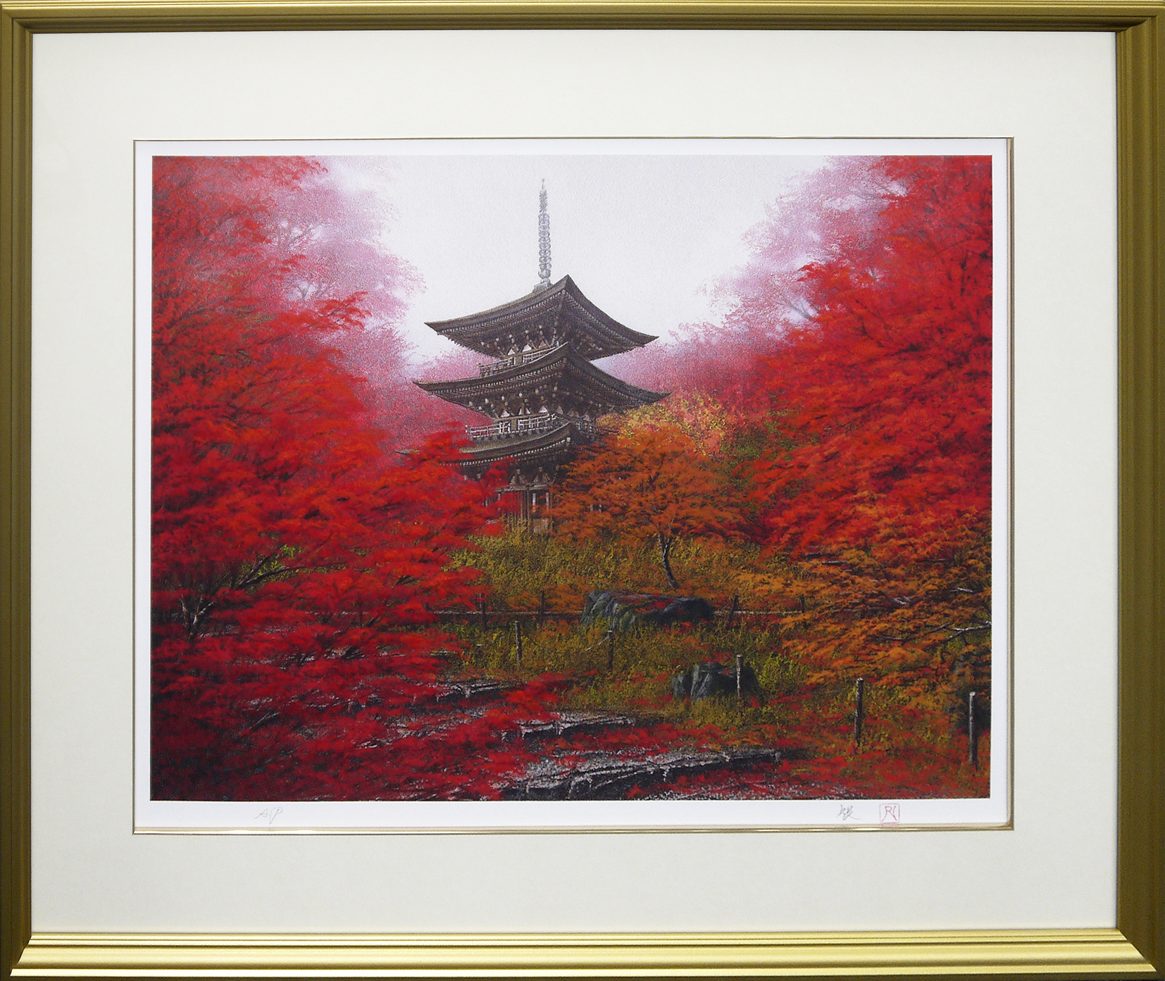 滋賀県にある西明寺の国宝三重塔を描いた、紅葉が美しい作品です。