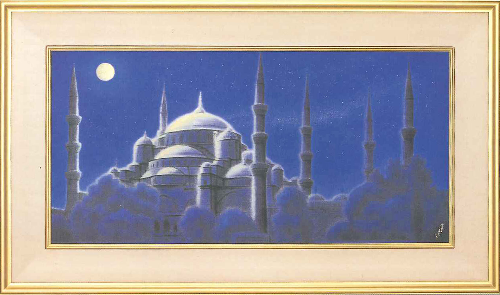 平成元年の院展に出品された、代表作の1点。幻想的な青とモスクの神秘的な雰囲気が印象的な作品。