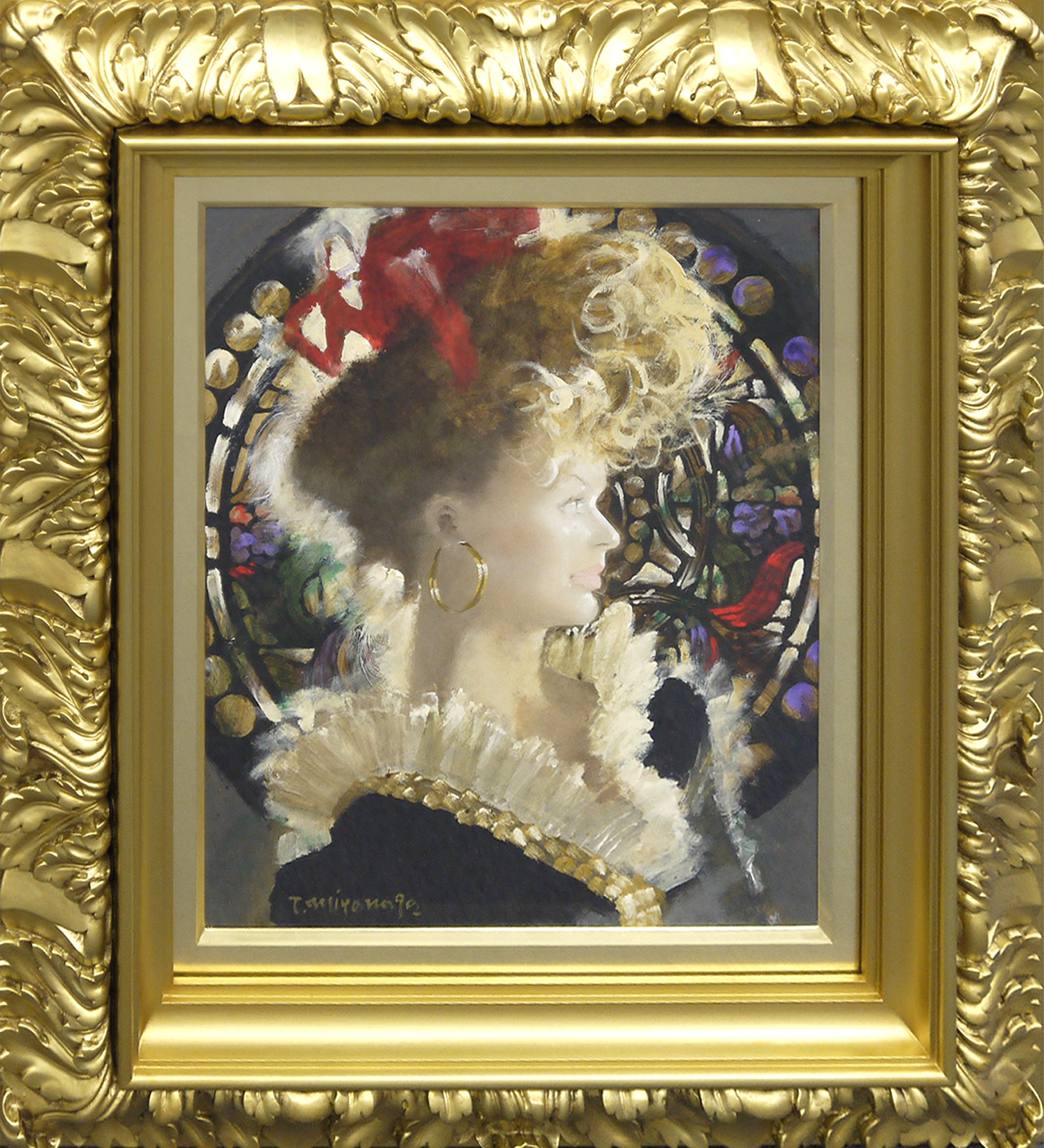 代表的な構図で人気も高い、ステンドグラスを背景に描いた作品です。