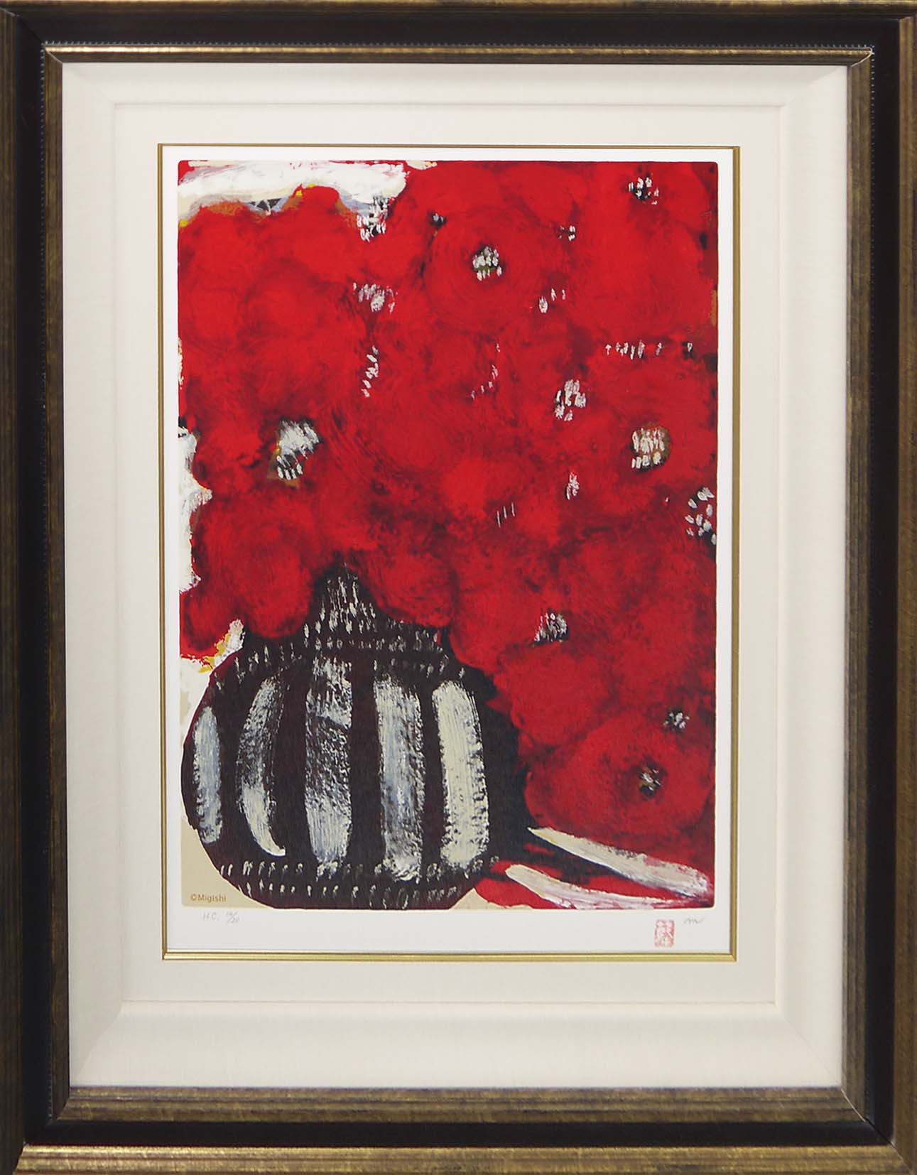 三岸節子らしい情熱的な力強い赤い花を描いた作品です。
