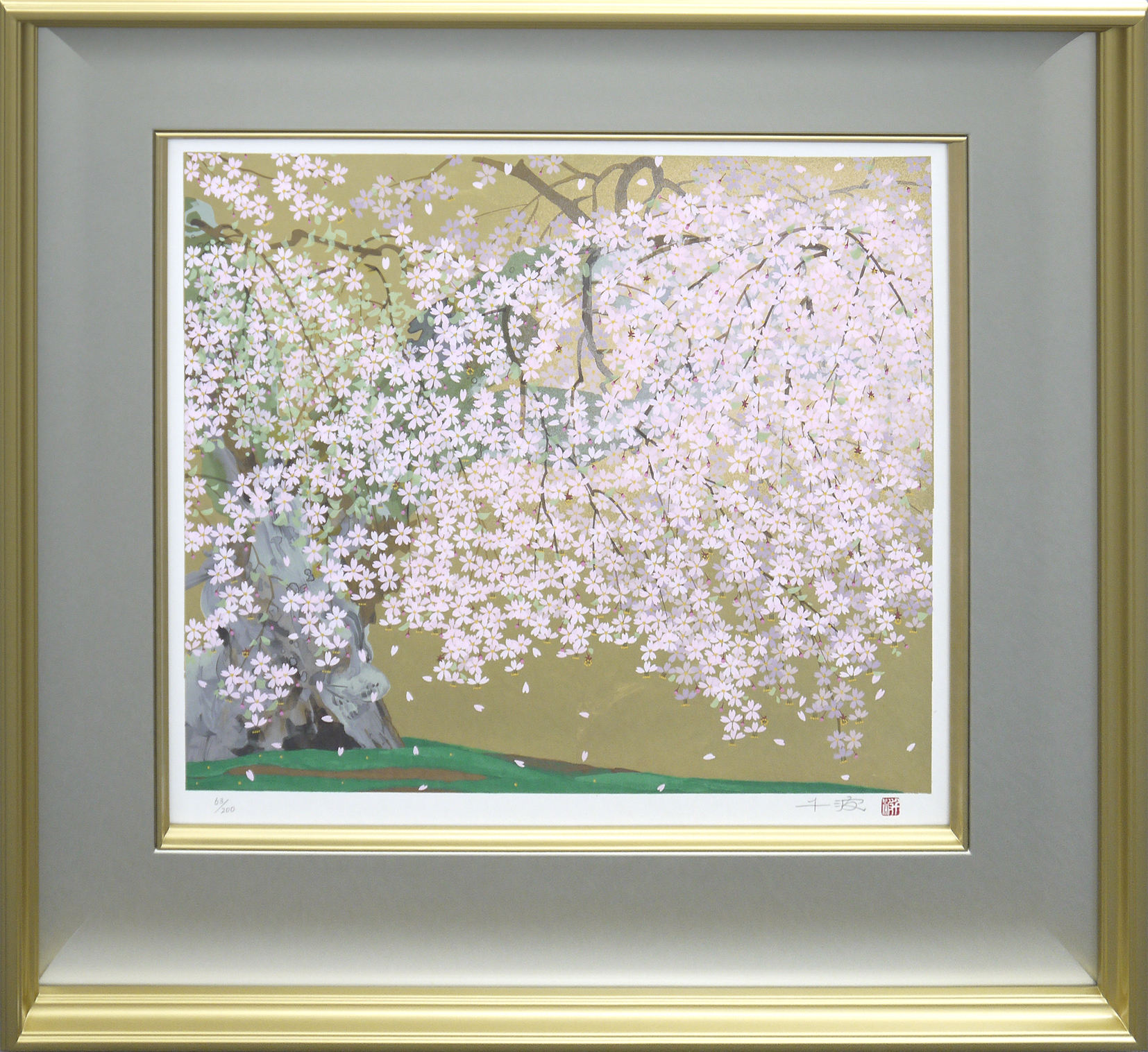 桜を描く人気画家・中島千波の最新版画です。京都最古の神社に咲く雄大な枝垂桜を描いた作品は、本金箔で華やかな仕上がりとなっております。