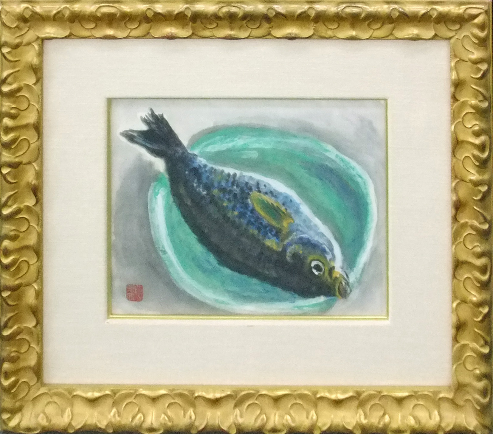 皿に置かれた魚を描いた大胆な作品です。水彩で描き、画面にも味わい深い雰囲気を出しております。