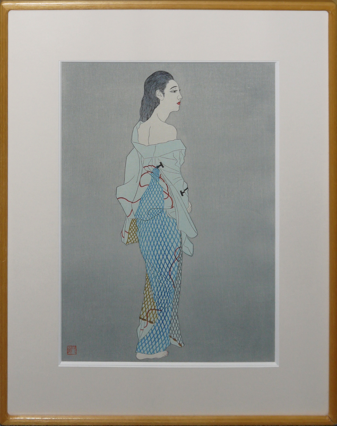 着物に彩られた干網の模様を美しく描いた加山又造の木版画です。