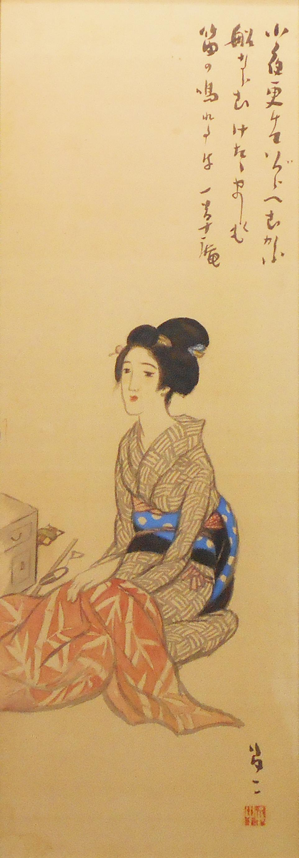 岡山県邑久郡本庄村に生まれる。子どもの頃より絵に魅かれた夢二は、神戸中学に進み、エキゾチシズムの洗礼をうけ、夢二は家出をし上京、画家を志望する。父の反対で早稲田実業入学。キリスト教者や幸徳秋水ら社会学者と交わる。時に夢二十九歳。一方、生活のために絵ハガキ製作をはじめ、二十三歳の時、早稲田鶴巻町で絵ハガキ店を開いた未亡人、岸たまきと出蓬い、結ばれる。彼女をモデルとして“夢二式"美女を描き、人気作家となる。「港屋」を共に開店したたまきや、笠井彦乃らとの恋は有名である。昭和六年に渡米するが成果を上げられず昭和八年、病で帰国。昭和9年「ありがとう」の言葉を最期に永眠。夢二の墓には、有島生馬の筆になる碑文「竹久夢二を埋む」が彫られている